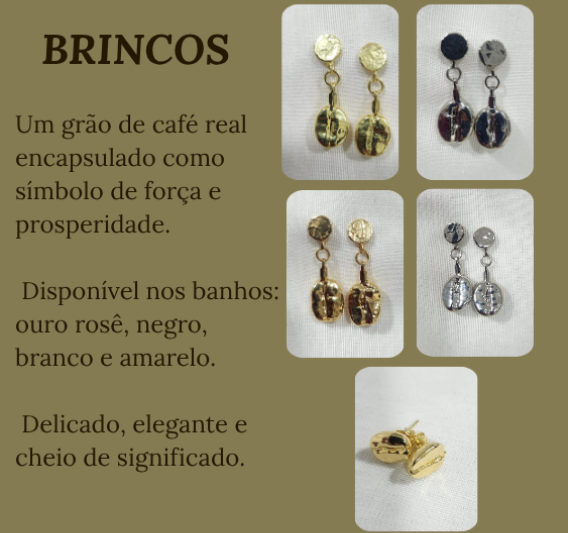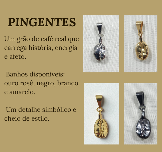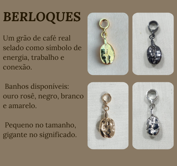 Inspirados na película dourada que envolve o grão – o “pergaminho” – criamos joias únicas com grãos reais de café, torrados artesanalmente e selados com banho de ouro 18K.