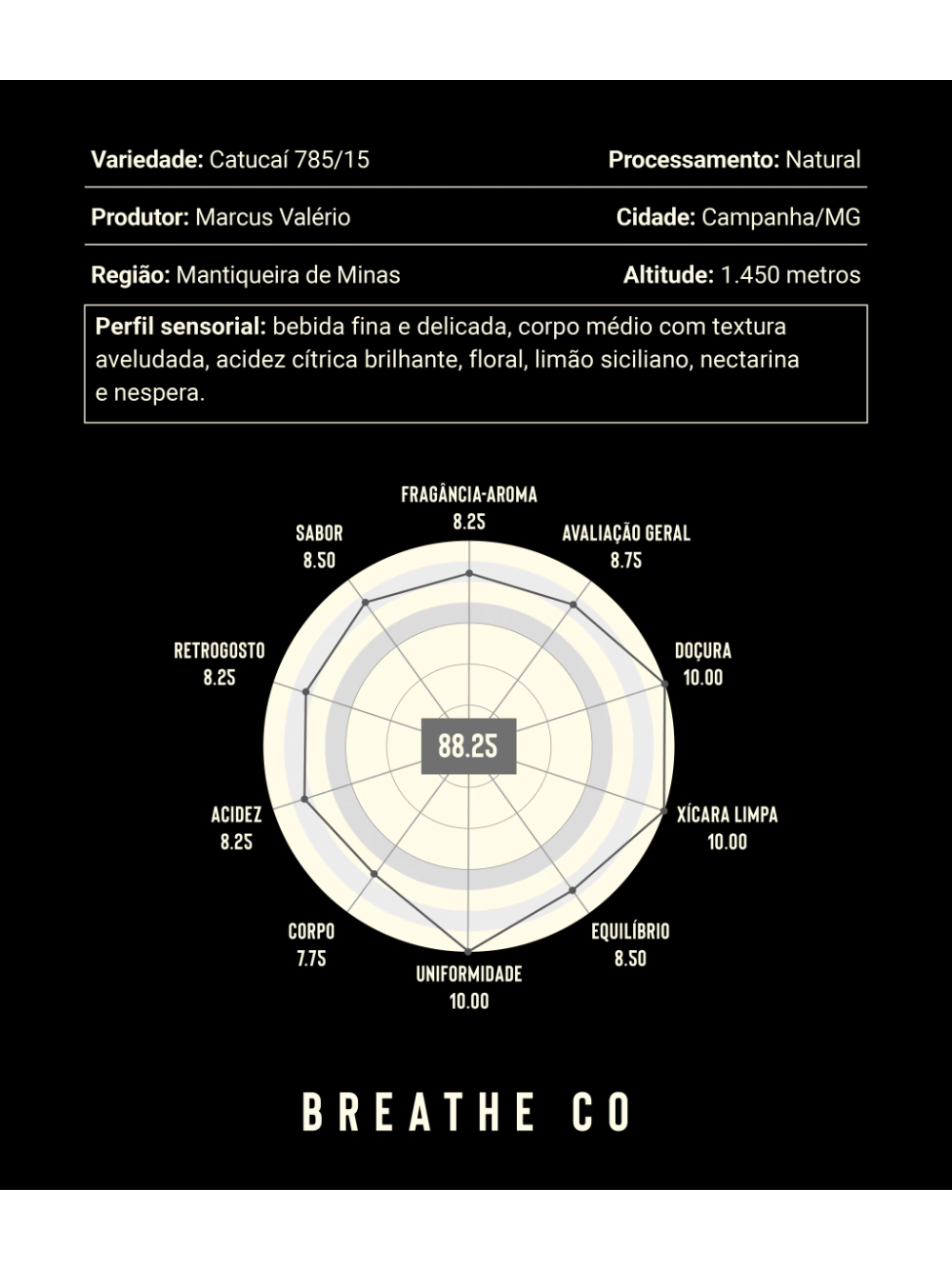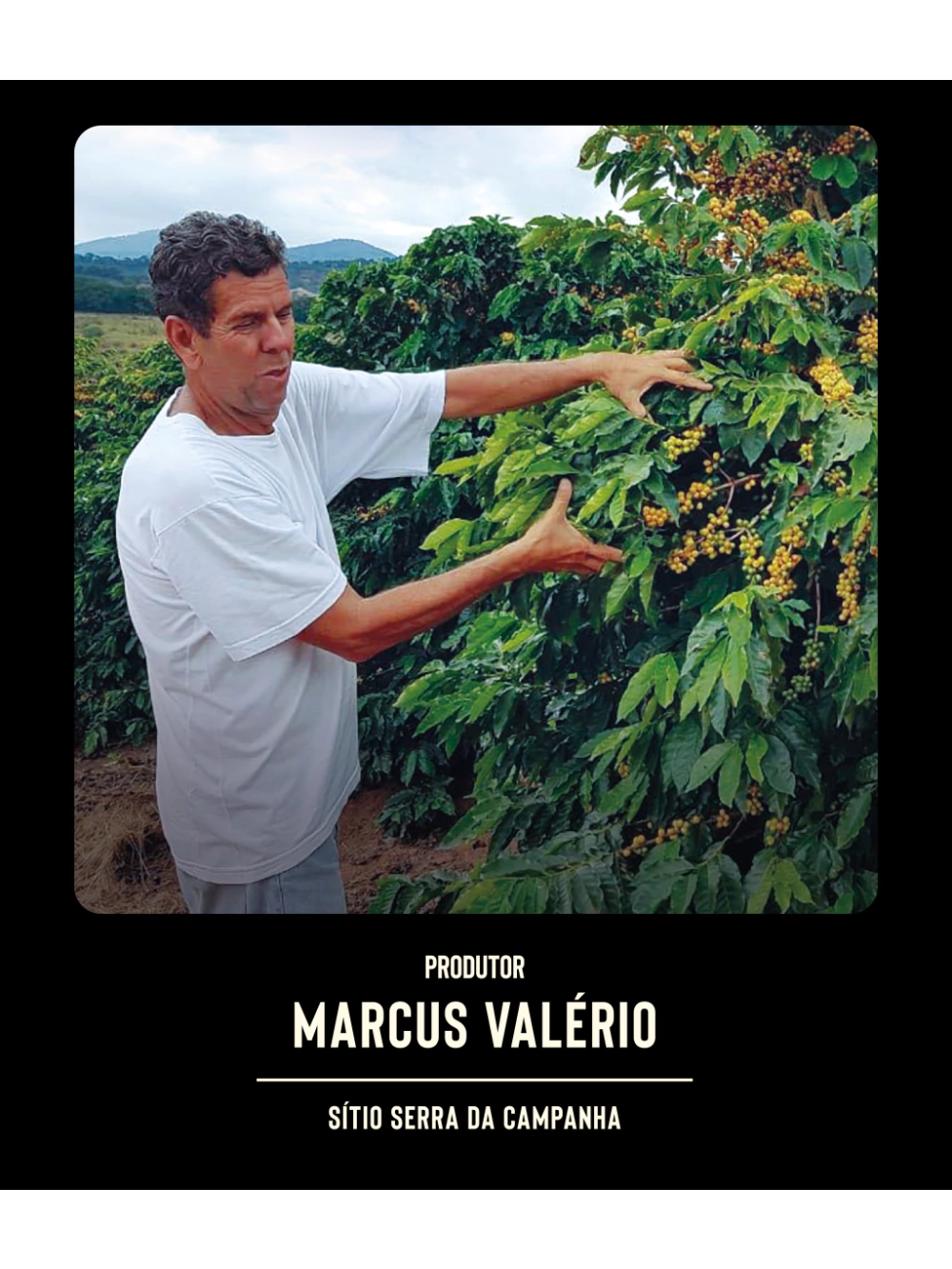 Catucaí 785/15 Natural - SCA score 88 Produtor: Marcus Valério - Sítio Serra da Campanha, Campanha/MG Perfil sensorial: Floral, pêssego, acidez cítrica pronunciada, finalização delicada e adocicada.