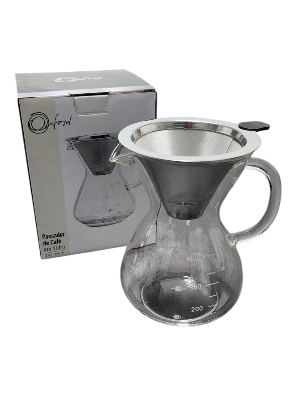 Passador de café com filtro em inox – 400 ml: CONJUNTO C/01 PASSADOR DE CAFE EM VIDRO 400ML C/ FILTRO EM ACO INOX- PRATEADO