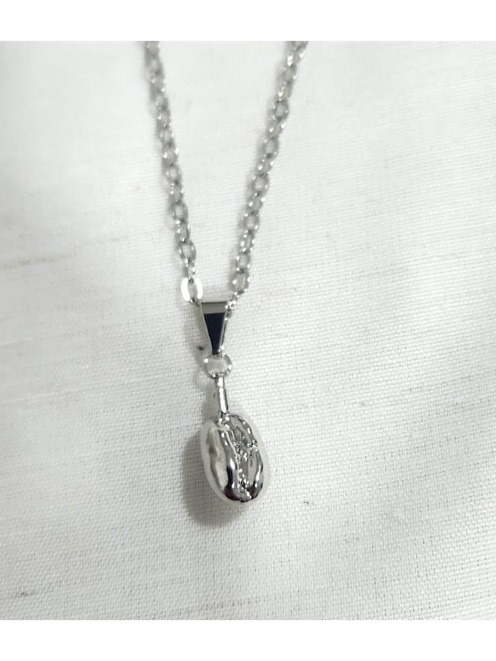 Confeccionado em ouro branco 18K — composto por 75% de ouro puro e metais nobres como paládio e prata — o pingente apresenta uma tonalidade clara e luminosa, que valoriza o contraste com o tom natural do grão de café e realça sua beleza artesanal.